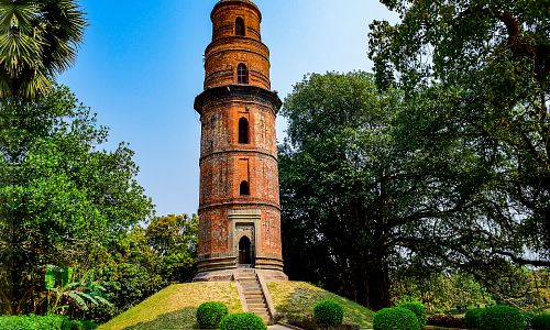 Firoz Minar, often called the “Qutub Minar of Bengal,” is a 26-meter-high tower located in Gour, near Malda. Built in the late 15th century by Sultan Saifuddin Feroze Shah, the minar served as a victory monument and possibly a watchtower. Its circular design, tapering structure, and decorative brickwork are fine examples of Tughlaq-style architecture. Visitors can climb a spiral staircase inside to enjoy panoramic views of the surrounding countryside, making it a popular spot for both history lovers and photographers.